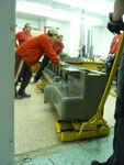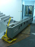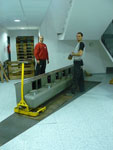 Podstavec sedí na vozících a je transportován ke schodišti. Pro ochránění dlažby je podlaha překryta koberci a plechovými pláty.