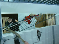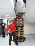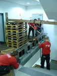 Podstavec je zvednut nad schodišťovou šachtu a pomalu spouštěn. Dokud nedosedne, je jištěn a vybalancováván. Palety dole slouží jako pojistka a jsou po jedné postupně odebírány.