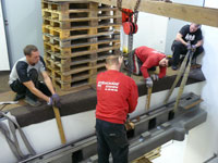 Podstavec je na paletách připravován pro instalaci transportních vozíků pro těžká břemena.